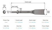 Su mango de 0,401 pulgadas (10,2 mm) garantiza compatibilidad con la mayoría de martillos y cinceladores neumáticos estándar. El cuello de 3/4 pulgadas (19,1 mm) y el cuerpo de 1/2 pulgada (12,7 mm) proporcionan rigidez estructural, mientras que la hoja de 1-1/8 pulgadas (28,6 mm) permite cortes precisos, limpios y controlados.