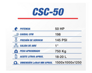 - Modelo: CSC-50 - Marca: CINCINNATI INDUSTRIAL AIRLINE - Tipo de Compresor: Tornillo - Potencia del Motor: 50HP - Voltaje / Fases: 220V / Trifásico - Presión Máxima: 145 PSI - Flujo de Aire: 198 PCM / CFM - Dimensiones del Empaque (L x A x H): 1500 x 1000 x 1250 mm - Peso: 750 kg